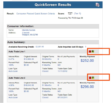 In addition to the credit data that is provided with QuickScreen, OpportunityAlerts are color-coded graphic icons that alert the dealer to potential opportunities based on specific data points in the customer credit summary. Triggers are set in the dealer’s QuickScreen implementation, and a proprietary algorithm reads data from the QuickScreen results and presents the appropriate alert/color.